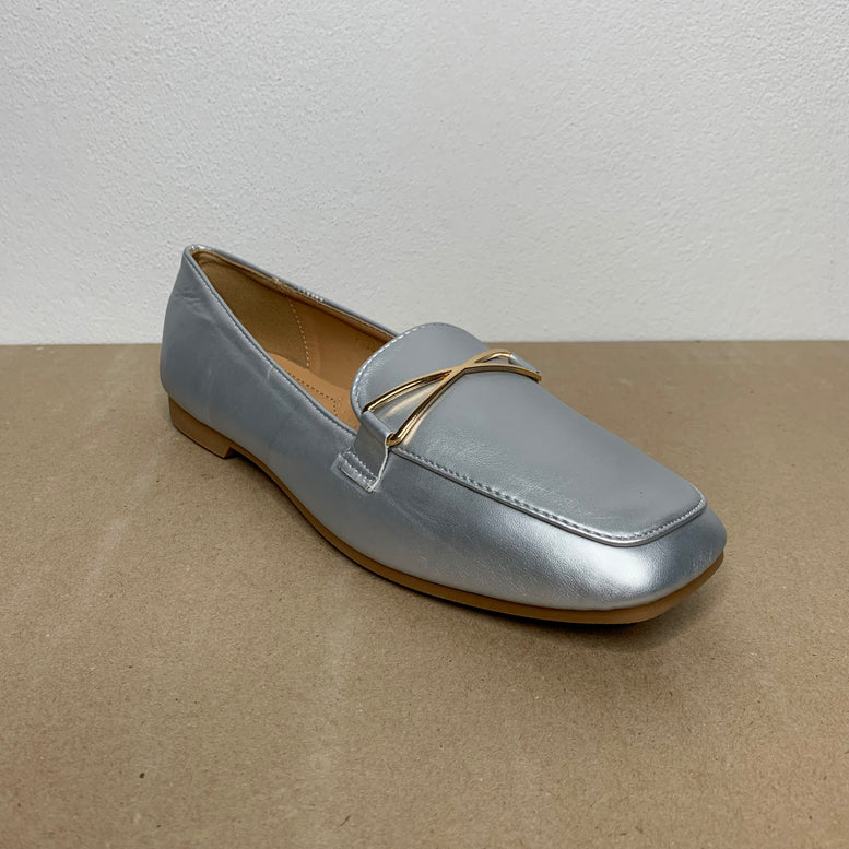 Elegante e confortável, este mocassim feminino é perfeito para compor looks modernos e sofisticados. Feito em material sintético de alta qualidade, possui acabamento metálico em prata, palmilha macia e detalhe dourado no peito do pé que adiciona um toque de charme. Ideal para o dia a dia, trabalho ou ocasiões casuais.