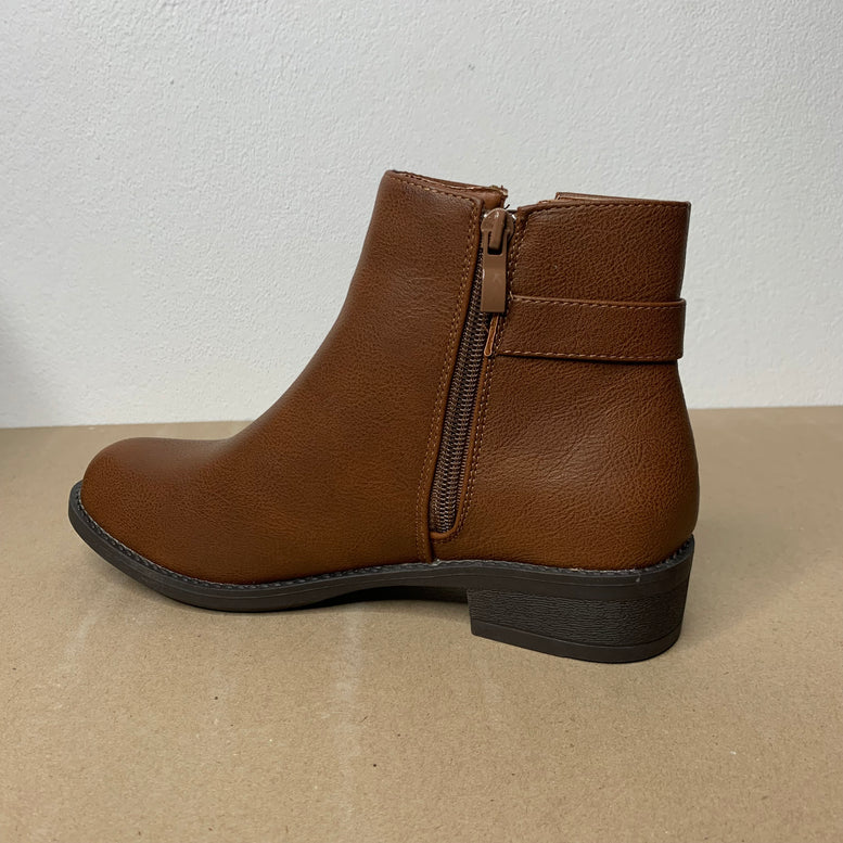 Clássico e versátil, este botim castanho é a escolha ideal para os dias mais frios. Confeccionado com material sintético de alta qualidade, possui detalhe de fivela lateral que adiciona um toque moderno e elegante ao visual. O fecho lateral garante praticidade e o salto baixo oferece conforto para o uso diário.