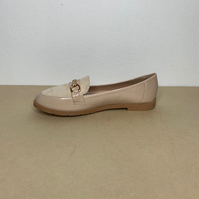 Mocassim bege em verniz e camurça, com corrente dourada no peito do pé.